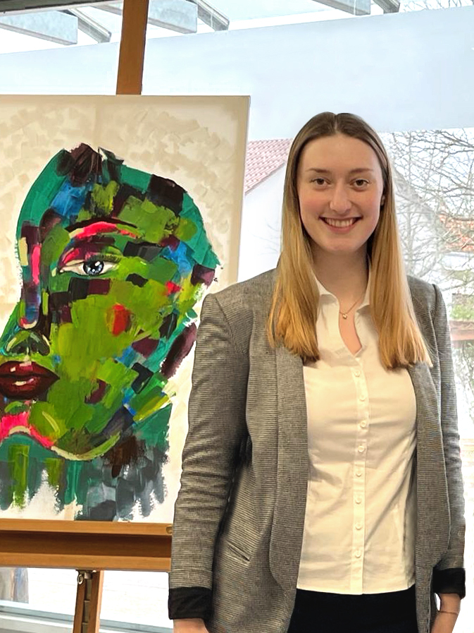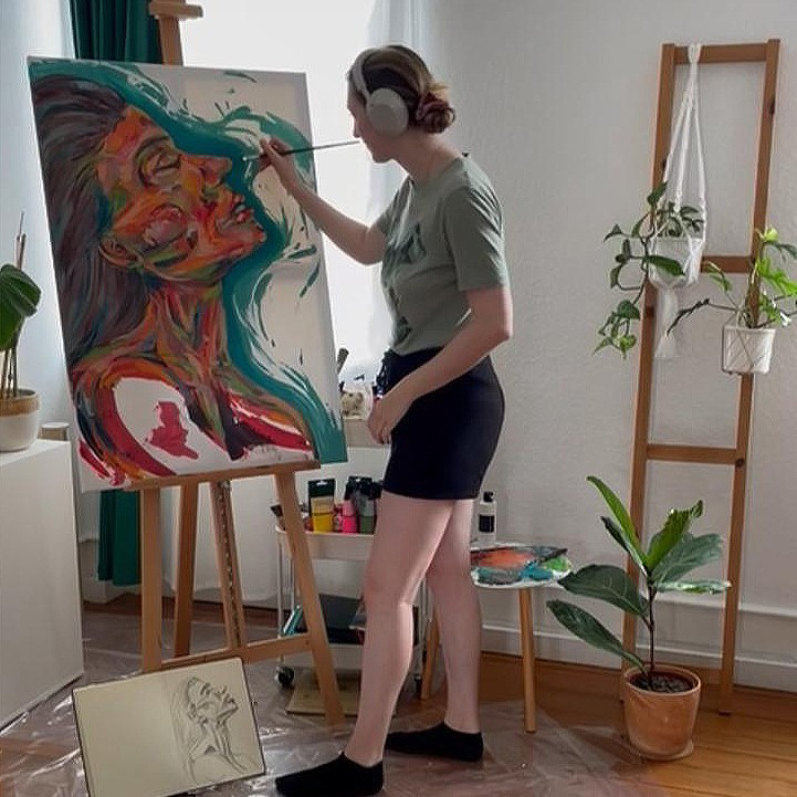 Mein Name ist Simone Uschold, ich bin 25 Jahre alt und als Künstlerin in Karlsruhe tätig. Kunst ist seit jeher ein zentraler Bestandteil meines Lebens. Während meines Architekturstudiums entdeckte ich meine Leidenschaft für das Aktzeichnen, was einen bedeutenden Einfluss auf meine künstlerische Entwicklung hatte. Die Auseinandersetzung mit dem klassischen Porträt und meine Faszination für Abstraktion führten zu der Idee meiner farbenfrohen Porträts.
